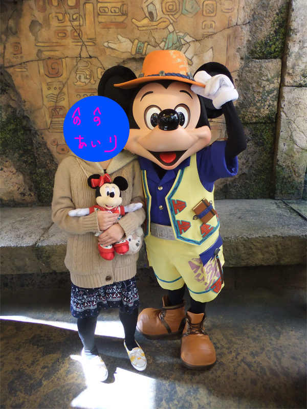 あと、奇跡的に前日のトレイルのミニーちゃんとのツーショットで写真撮った時被ってたので、その写真も見せながら。